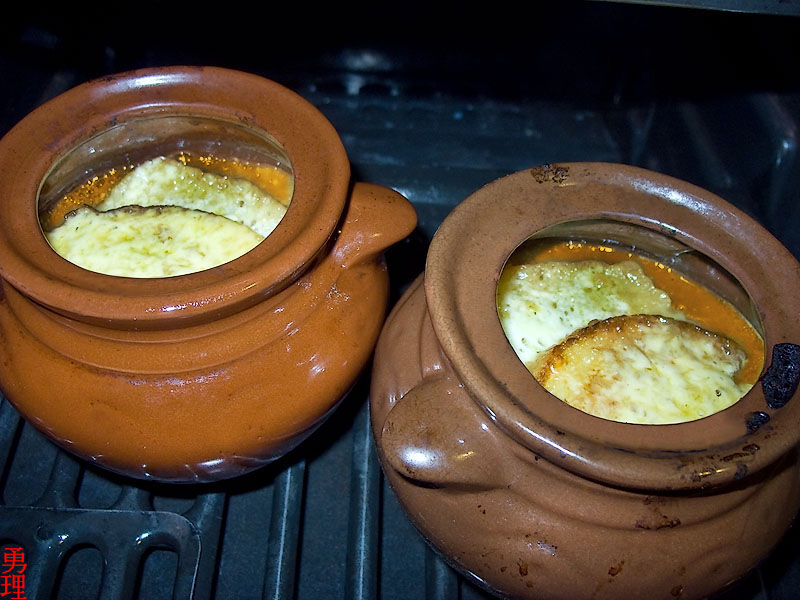 Отправляем горшки в хорошо разогретую духовку, желательно под гриль. 10-15 минут и сыр запечется на всплывших гренках