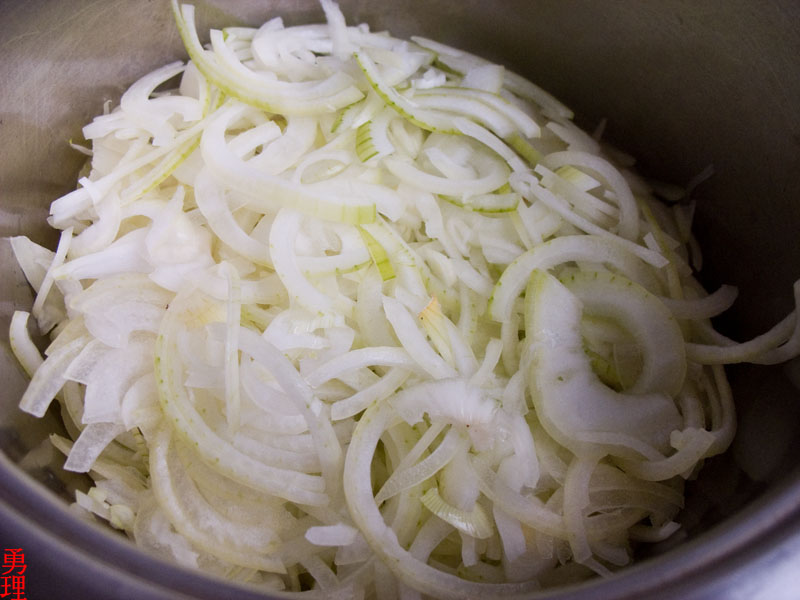 Нарезанный полукольцами лук занимает больше половины объема 3-х литровой кастрюли.