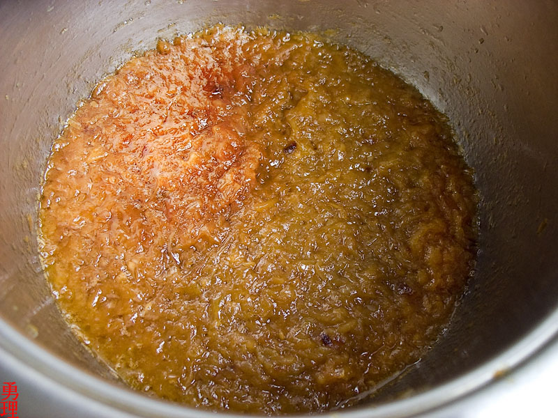 В самом же конце, когда лук станет янтарным, огонь нужно сделать ещё меньше и уже никуда не отходить и мешать лук, постоянно соскребывая прилипший сок со дна и стенок.