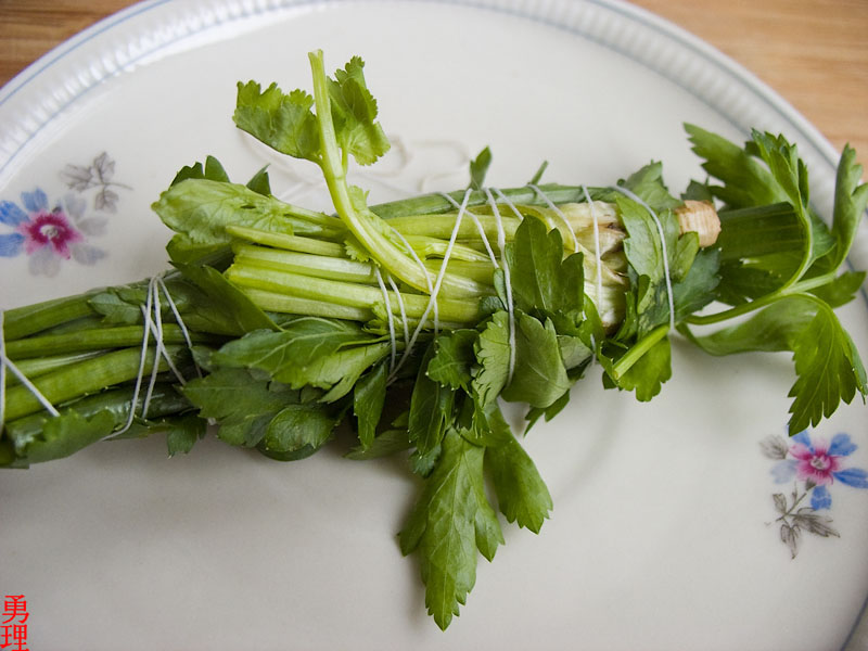 Подготавливаем зелень, связав её в компактный пучок, чтобы потом не пришлось вылавливать её по веточке из супа.