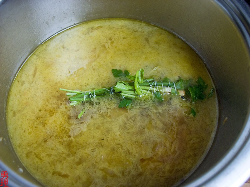 В кастрюлю с луком наливаем бульон, кладем наш зеленной букет, прибавляем огонь и варим все примерно 25-30 минут. Прибавляем соль, перец, пробуем - если чувствуется кислота от вина, нейтрализуем её сахаром - не переусердствуйте! В конце варки можно добавить пару ложек коньяка(на любителя!) и убрать зелень.