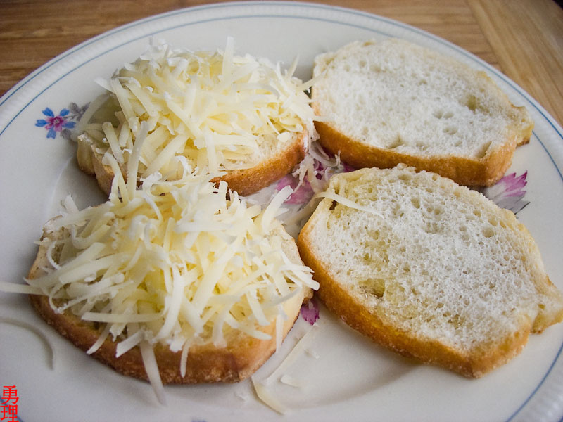 Теперь пришла очередь сделать тосты.Для этого нарезаем багет поперек наискось на ломти толщиной около сантиметра, подсушиваем их на противне в духовке или обжариваем ломти на сковороде с маслом до хорошего румянца и сухости и между ними насыпаем натертый сыр( у меня был грюйер).